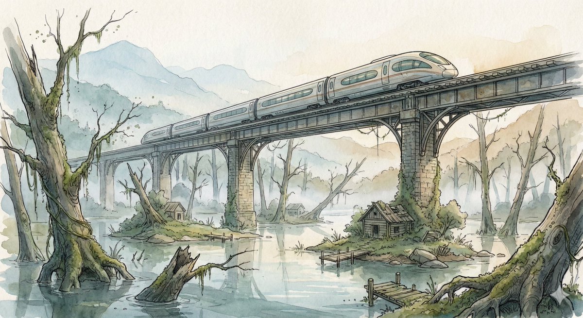 A detailed prompt for generating a fantasy watercolor illustration featuring a high-speed train on an elevated rail bridge spanning a mysterious flooded forest valley, emphasizing traditional watercolor techniques and a soft, atmospheric palette.