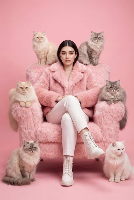 A detailed prompt for Gemini Nano Banana Pro to create a highly stylized, monochromatic pink fashion editorial portrait of a woman in a plush faux-fur armchair, surrounded by cats, using an uploaded image as a reference for the face.