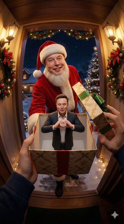 A prompt for Nano Banana Pro to generate a first-person perspective image of receiving a Christmas gift. The 'Subject' (e.g., Zootopia's Judy Hopps) is dressed as Santa Claus delivering the gift, and the gift box contains a 3D miniature model of the subject making a heart shape. It uses a wide-angle, cinematic style with strong Christmas atmosphere.