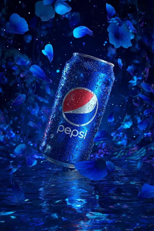 A prompt for Nano Banana 2 to generate a hyperrealistic image of a Pepsi can floating mid-air, surrounded by glowing blue cosmic petals, emphasizing metallic textures, condensation droplets, and reflections on the water surface below.