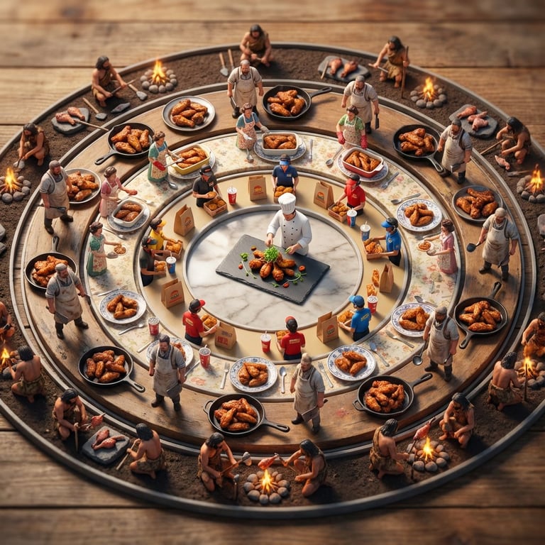 A complex, multi-layered prompt for generating a hyper-realistic 'Food History Diorama' arranged in a Mandala format, using spicy chicken wings as the subject. It requires five concentric rings, each representing a different historical era (Modern, Commercial, Domestic, Industrial, Ancient), populated by tiny 1:87 scale chef figures dressed appropriately for that era, with specific instructions for lighting, scale, and texture changes across the rings.