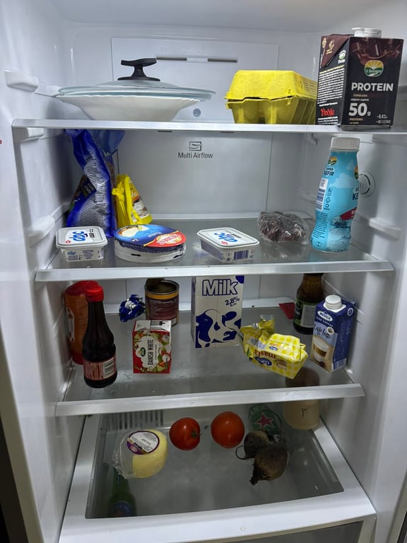 A conceptual prompt for turning the contents of a fridge into a simple step-by-step recipe infographic, useful for cooking or food content.