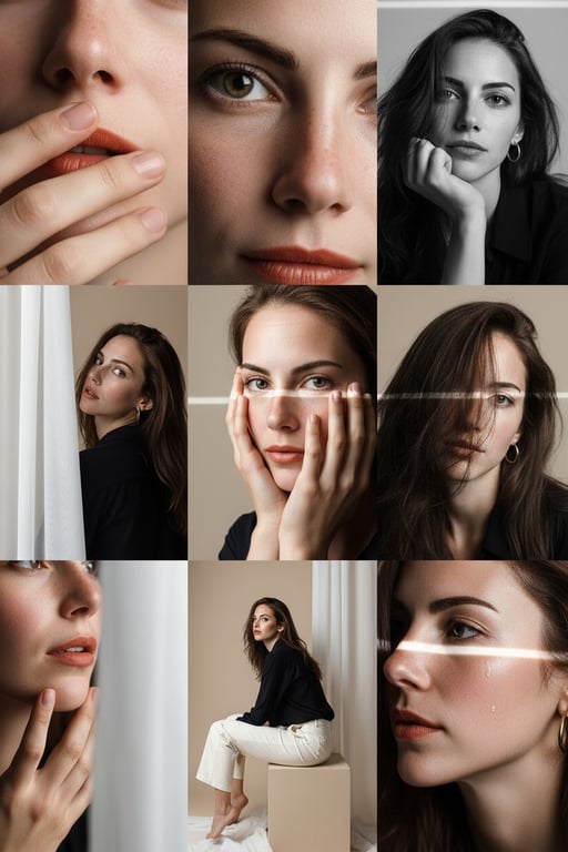 A detailed image generation prompt designed for Gemini nano-banana, specifying setting, character attire, lighting, and a 3x3 grid of specific photographic compositions and camera details.