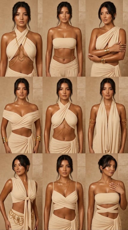 An extremely detailed, structured JSON prompt for Nano Banana Pro, designed to generate a 3x3 high-fashion editorial grid featuring the same elegant woman with gold body jewelry and draped styling in nine different poses/compositions, emphasizing consistency and a divine, regal mood.