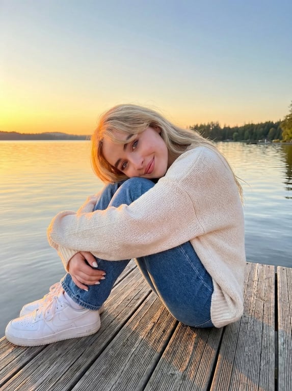 A detailed Nano Banana Pro prompt for generating an ultra-realistic portrait of a female subject sitting on a wooden dock during sunset, emphasizing warm golden hour lighting, soft reflections, and the use of a reference image for exact facial identity.