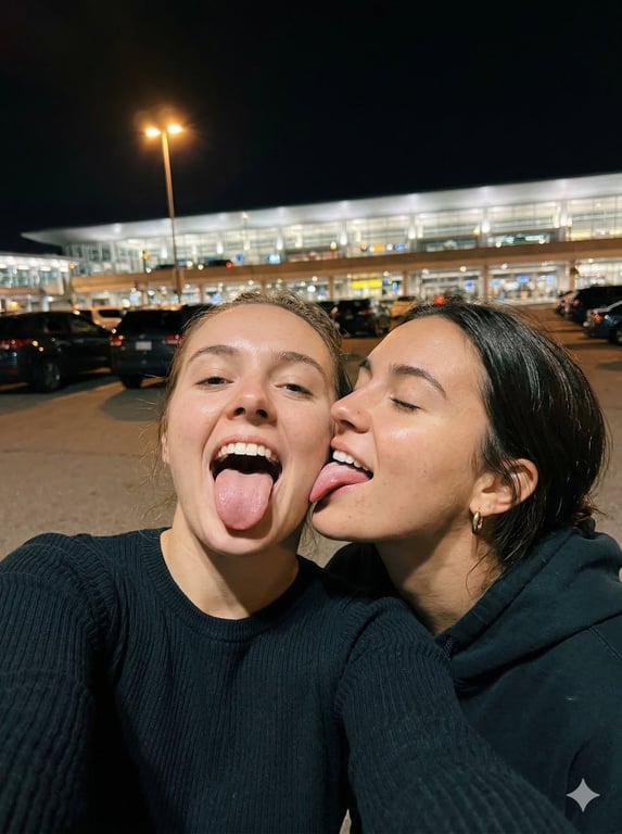 A highly detailed JSON prompt for Nano Banana Pro to generate a casual, goofy, close-up smartphone selfie (3:4 aspect ratio) of two young women at night in a parking lot. The prompt specifies a playful pose where one woman is licking the other's cheek, emphasizing wide-angle distortion, natural skin textures, and low-light smartphone photo quality.