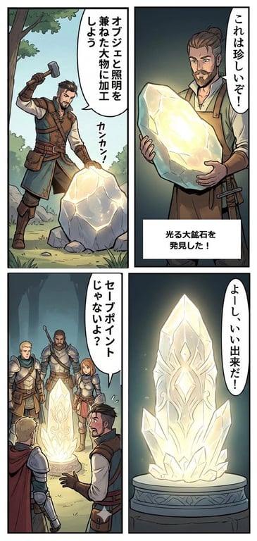 This tweet discusses the 64th work created using Google Nano Banana, titled 'Habits of Adventurers.' The creator manually reconstructed a four-panel comic strip that ignored the vertical stacking instruction and instead moved horizontally. The image depicts adventurers gathering like moths to a streetlamp, drawn to a mysterious stone, suggesting a scene from a fantasy game where players would instinctively 'investigate' such an object.