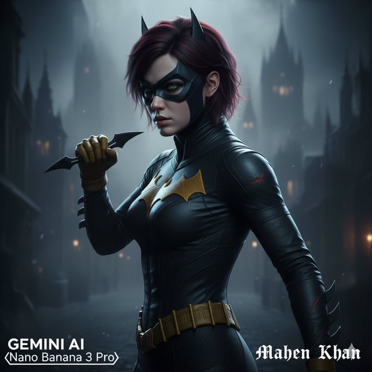 A comprehensive, multi-format prompt (including Midjourney and Stable Diffusion tags) for Gemini Ai Nano Banana 3 Pro. It requests a hyper-realistic, cinematic portrait of a female vigilante (Batgirl inspired) in a gothic noir aesthetic. It details her appearance (short reddish-black hair, pale skin, green eyes), action (adjusting her bat-shaped mask), and outfit (dark textured leather bodysuit), emphasizing dramatic chiaroscuro lighting and high-fidelity textures.
