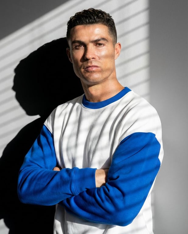 A prompt for generating an ultra-realistic fashion studio portrait of a confident man and woman in matching sweatshirts. The key feature is the dramatic sunlight casting strong, striped shadows across their faces and clothing, achieving an editorial fashion photography style with high contrast and detail.
