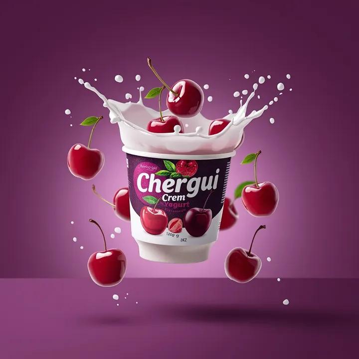 A detailed prompt for generating high-end commercial product photography of a yogurt cup, captured mid-air with a dynamic milk splash wave. It specifies packaging details, surrounding elements (fresh cherries), lighting (soft studio), and composition (centered, front-facing angle) for a clean, vibrant, and ultra-realistic result.