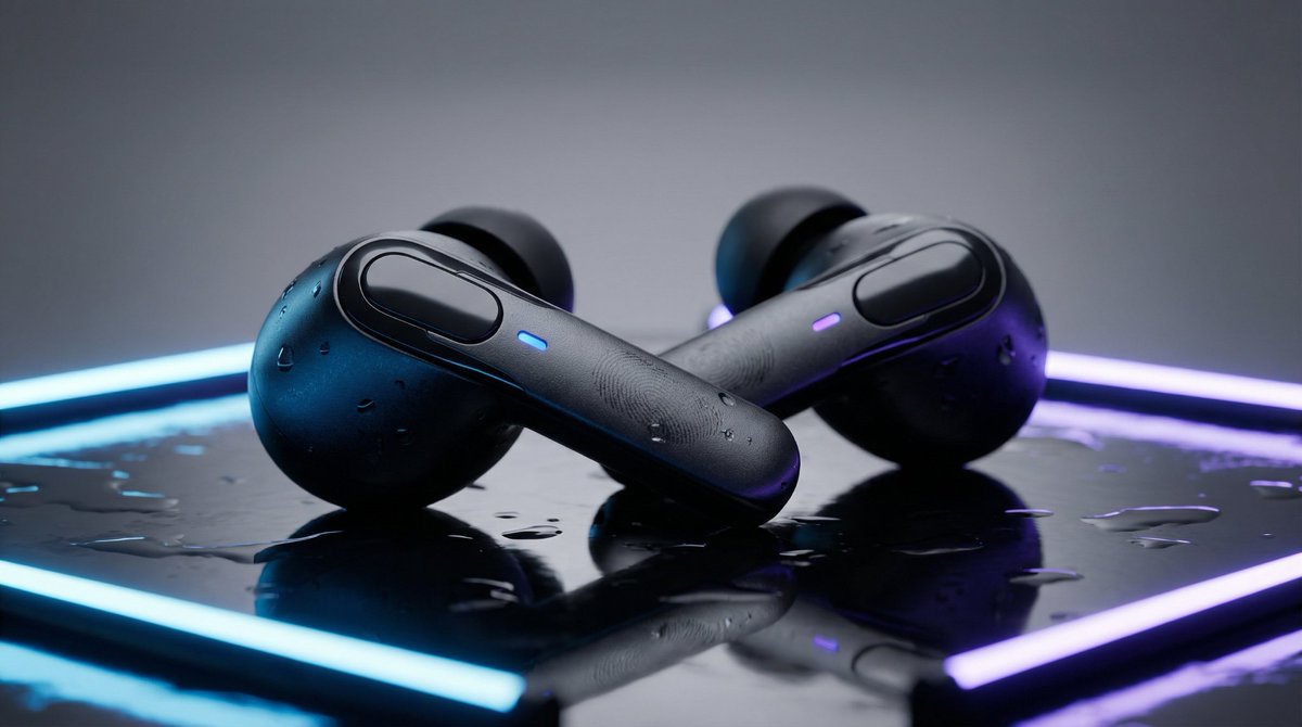 A structured prompt for generating a high-end product mockup suitable for e-commerce or tech ads. It specifies matte black wireless earbuds, a minimalist studio setting with a wet reflective surface, cinematic contrast lighting, and technical details like 8K resolution and a 50mm macro lens.