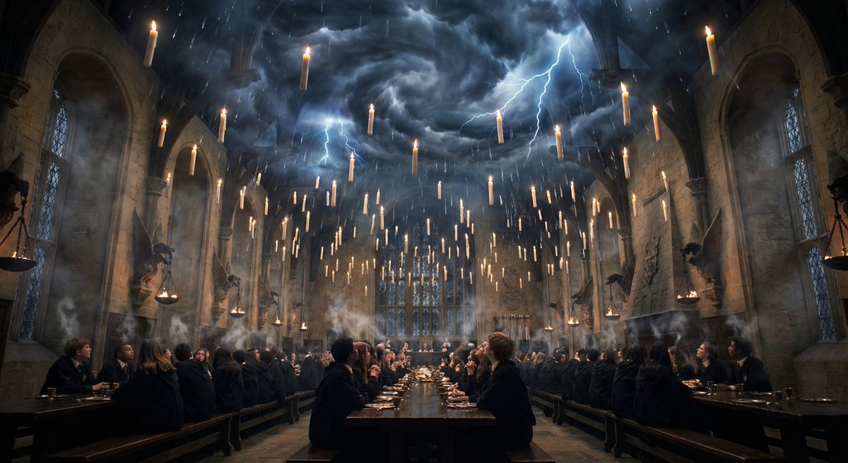 A descriptive prompt for generating a dramatic scene of the Hogwarts Great Hall during a thunderstorm. The prompt specifies the enchanted ceiling showing violent lightning, thousands of flickering floating candles, and rain evaporating just above the students, emphasizing the gothic architecture and foggy darkness. This prompt is listed for Nano Banana Pro, Midjourney v8, and Uni -1.