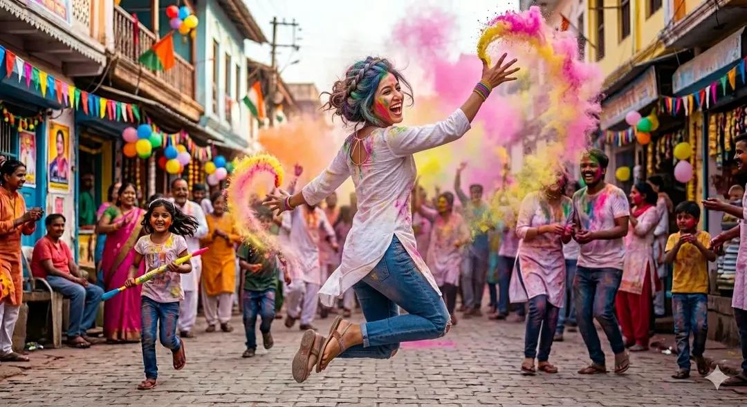 A highly structured JSON prompt for generating an ultra-realistic, cinematic 8K photograph of a young Indian woman celebrating the Holi festival in a traditional town street, focusing on dynamic action, vibrant colors, and detailed environmental elements.