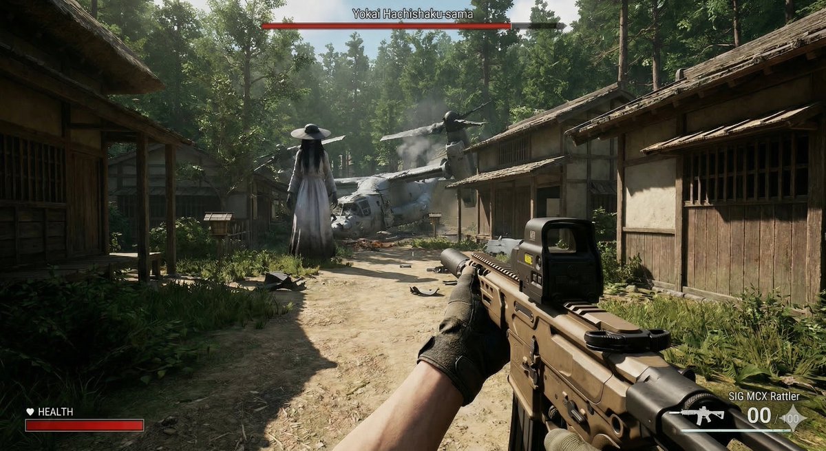 A prompt used with Nano Banana Pro via Google Gemini 3.1 to generate an image depicting a confrontation between a human and the Yokai Hachishaku-sama, rendered in the style of a First-Person Shooter (FPS) game.