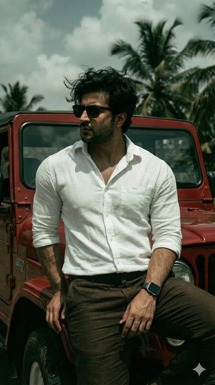 A structured JSON prompt for generating a hyper-realistic cinematic portrait of a young man, ensuring a 100% face match to the uploaded photo. It specifies a dramatic, bold attitude, a relaxed white shirt, and a dark green color grading, set in a windy outdoor environment with palm trees and a red Jeep.