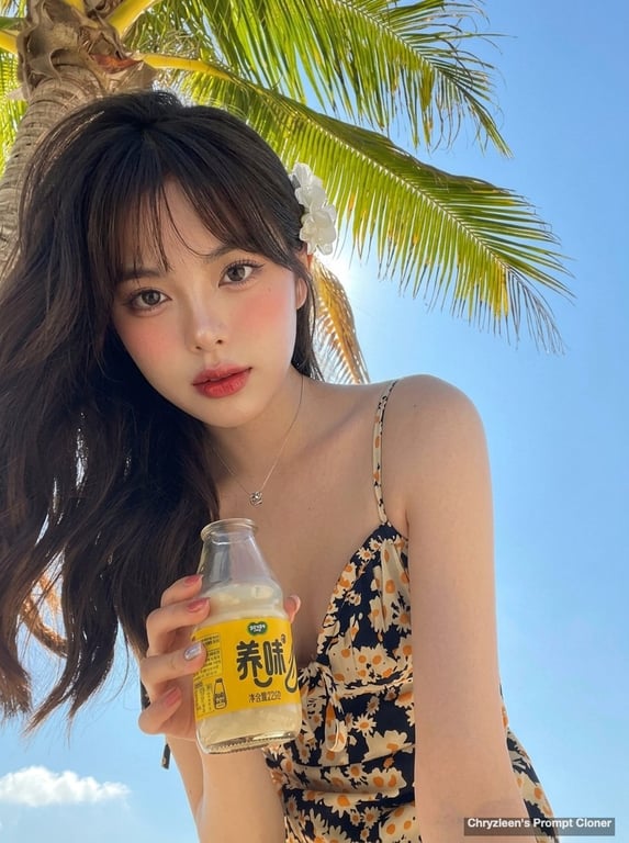 A complex, hyper-realistic image generation prompt for Gemini Nano Banana, requiring the use of a reference image for character appearance. The prompt details a specific scene: a subject in a sundress holding a bottle, framed by palm fronds against a blue sky, rendered with iPhone 15 Pro clarity, motion blur, and low-fidelity digital artifacts.