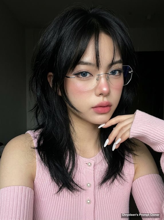 A detailed prompt for Gemini Nano Banana (implied Pro or base model) to generate a hyper-realistic, ultra-sharp photograph of a young woman with a black wolf cut, emphasizing specific camera settings, pose, makeup, and lighting, while maintaining a strong resemblance to a provided reference image.