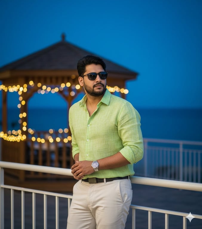 A detailed prompt for generating a hyper-realistic medium-shot portrait of a sophisticated man at a luxury seaside resort during 'blue hour,' emphasizing specific clothing (lime-green linen shirt), bokeh effect from fairy lights, and requiring the use of a reference photo for facial consistency.