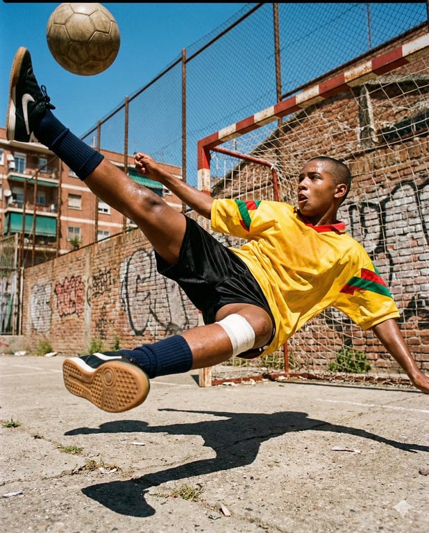 A detailed prompt for generating a hyper-realistic, high-shutter-speed action shot of a young male athlete executing a spectacular overhead bicycle kick on a gritty urban concrete soccer court, emphasizing harsh midday sun lighting and cinematic advertising aesthetics.