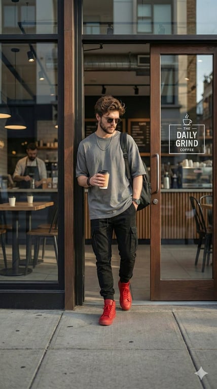 A prompt for generating a hyper-realistic, cinematic full-body portrait of a young man in streetwear leaning against a modern café doorway, focusing on detailed accessories, natural daytime lighting, and a shallow depth of field.