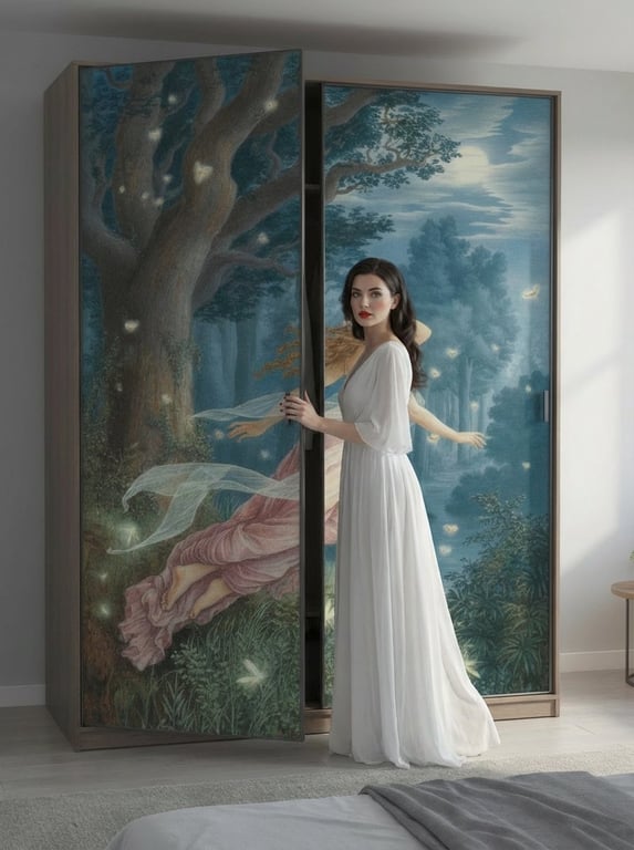 This is an image generation prompt specifically for the 'Nano Banana Pro' tool, intended to create a scene featuring a beautiful model opening a wardrobe door. The prompt also explicitly mentions the use of a mockup image as a reference for the wardrobe design.