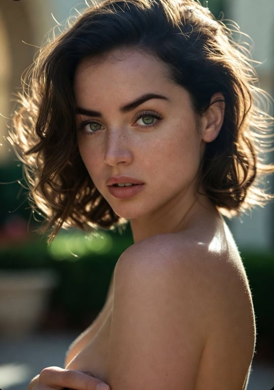 An image generation prompt structured for image-to-image fusion, aiming to preserve the facial identity of Ana de Armas (from a reference image) while transferring the outfit and texture attributes from a second reference image. It specifies hyper-realistic skin texture, dynamic pose, golden hour lighting on an upscale outdoor terrace, and 4K UHD quality. Note: This prompt was explicitly stated to be generated using Grok, not Nano Banana Pro, but is included as a structured prompt example.
