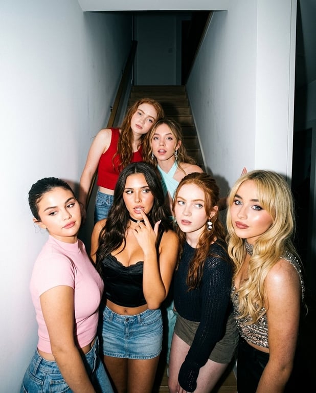 A highly structured JSON prompt for Nano Banana (likely Pro/2) to generate an indoor group photo featuring six subjects (including Selena Gomez, Madison Beer, Sadie Sink, Sydney Sweeney, and Sabrina Carpenter) in a hallway. The prompt emphasizes a raw iPhone flash capture aesthetic, harsh lighting, visible skin imperfections, and requires six reference images for exact identity preservation.