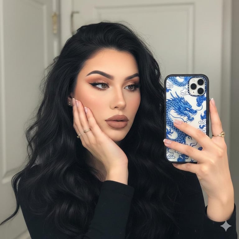 A detailed JSON-formatted prompt for generating a close-up, high-quality mirror selfie in the Instagram aesthetic, focusing on the subject's full professional makeup, dark wavy hair, and a distinct phone case featuring a bright blue and white Chinese-style dragon illustration.