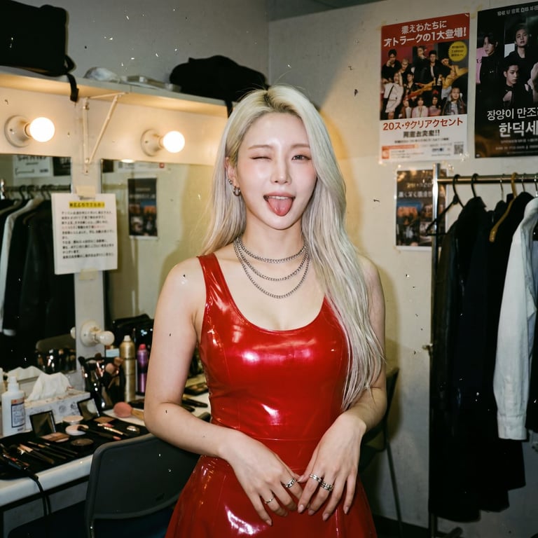 A structured JSON prompt for Nano Banana Pro to generate a Japanese analog film photograph with a muted color palette. The subject is a woman with platinum blonde hair wearing a vibrant red latex outfit, captured in a candid moment backstage.