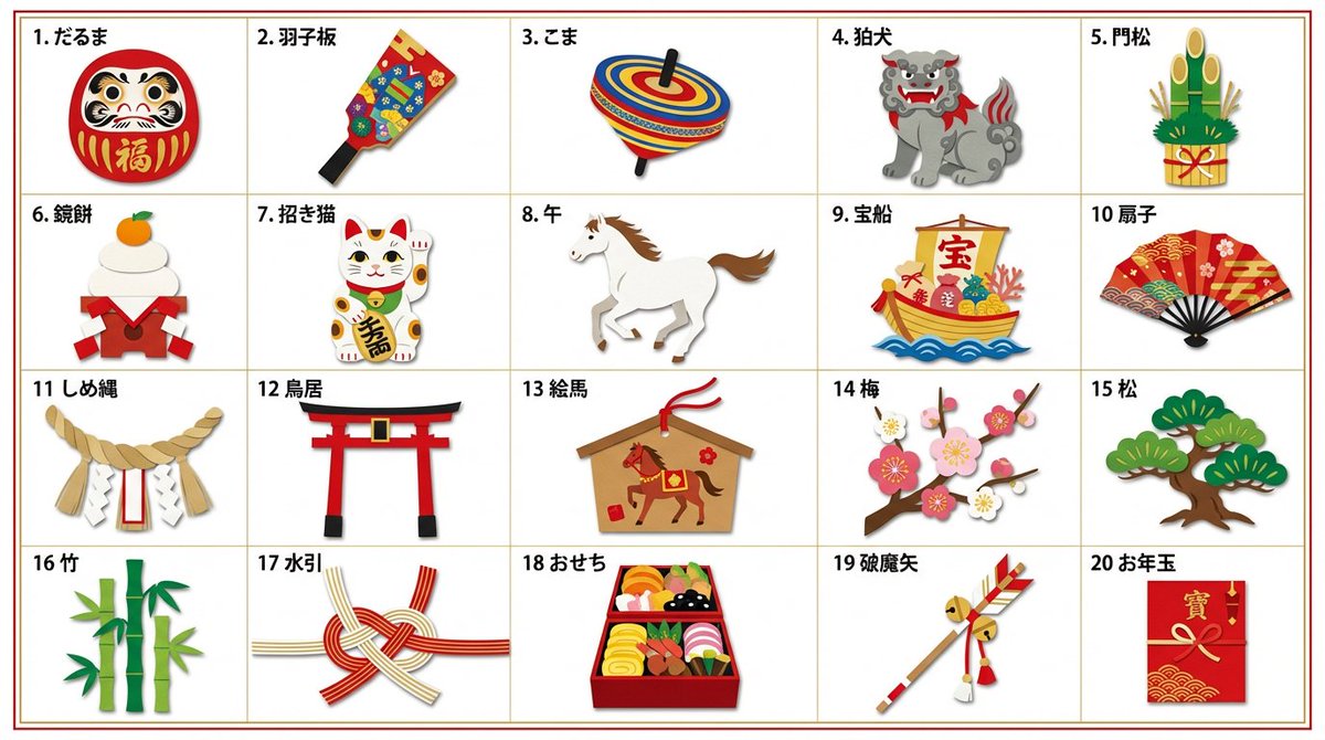 A prompt designed for the Nano banana pro model to generate a set of Japanese New Year's themed icons in a Kirie (paper-cutting) style. The icons feature traditional items like Daruma, Hagoita, Koma, Komainu, Kadomatsu, Kagami Mochi, Maneki Neko, and the year's zodiac animal (Horse). The prompt specifies the arrangement of the icons in a neat 4x5 grid, with each icon labeled with a sequential number in the top-left corner.