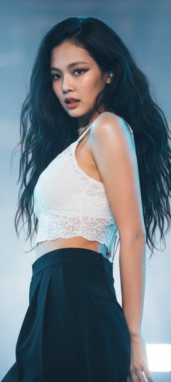 A structured JSON prompt for generating a high-contrast, cinematic image of K-pop star Jennie Kim (BLACKPINK) during a performance. The prompt specifies her dynamic pose, 'glass-skin' aesthetic, stage outfit (white lace crop top, black pleated bottoms), and dramatic lighting (high-contrast stage spotlights with cool blue rim light and cinematic haze).