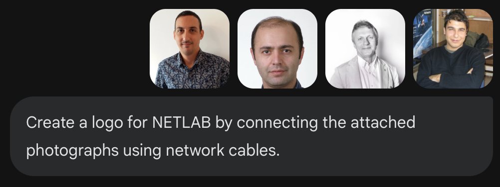 A prompt instructing the AI to design a logo for a research lab by joining photos of lab faculty using network cables. This is a complex image manipulation/generation task based on input images.