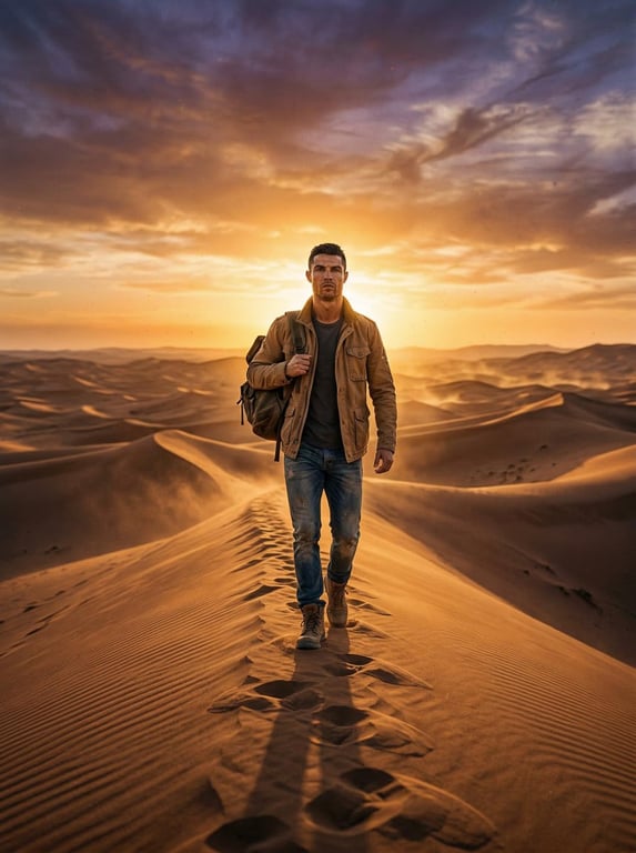 A prompt for Gemini Nano Banana 2 to generate a hyper-realistic cinematic photograph of a lone traveler in the Saharan dunes, emphasizing the scale, dramatic golden hour backlighting, and detailed textures.