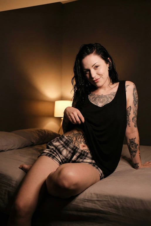A detailed JSON prompt for Nano Banana 2, aiming for a low-light iPhone realism portrait of an alternative beauty with an extreme hourglass silhouette and extensive tattoos. It specifies the scene (dark loft bedroom), lighting (warm side lamp 3000K), and technical details (iPhone 17 Pro, slight handheld motion, authentic color science).