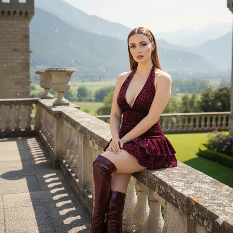 This is a highly detailed, structured prompt designed for luxury fashion photography generation, focusing on specific aesthetic targets (Douyin-Influencer, Modern Editorial) and technical parameters. It specifies the subject (Ana de Armas), attire (deep burgundy velvet mini dress and knee-high boots), environment (European Classical Villa Terrace with a castle backdrop), and detailed optical settings (3:4 aspect ratio, high saturation, shallow depth of field).