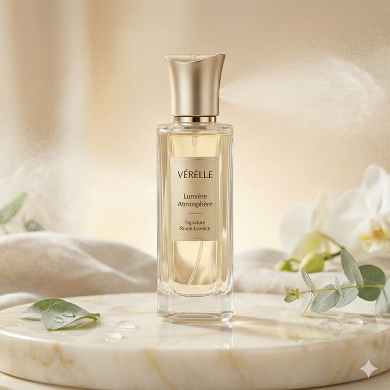 A highly detailed JSON prompt for generating ultra-realistic commercial photography of a luxury room freshener spray, focusing on composition, high-end lighting, and a refined interior lifestyle aesthetic.