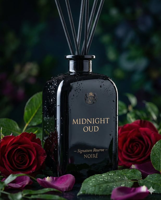 An ultra-realistic prompt for premium product photography, focusing on a deep obsidian glass reed diffuser bottle with metallic gold labeling. The scene is dramatic and cinematic, featuring condensation, dark crimson roses, and lush foliage, using low-key lighting and shallow depth of field for a luxury fragrance campaign aesthetic.