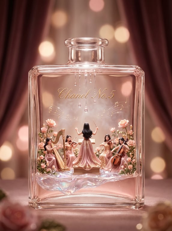 A highly detailed, couture-style prompt for generating a macro photograph of a luxury skincare serum diorama, featuring miniature Korean women musicians and a conductor performing in a serum pool inside a Chanel No. 5 perfume bottle.