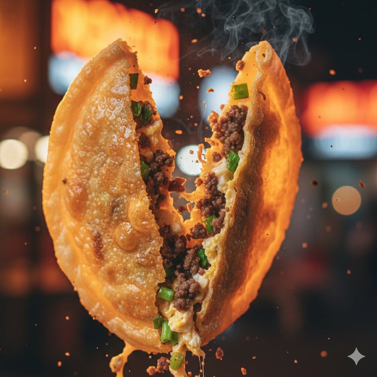 A highly specific prompt for generating hyper-realistic macro food photography of Martabak Telur (Indonesian street food) tearing open mid-air, focusing on texture, motion freeze, and warm street-stall lighting.