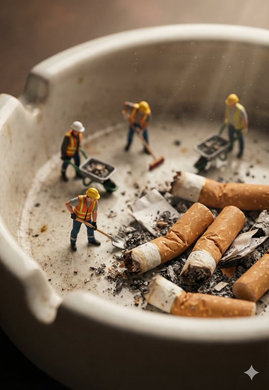A structured prompt for generating an ultra-realistic cinematic macro photograph symbolizing quitting smoking, featuring miniature construction workers cleaning a giant ashtray filled with cigarette butts and ash, emphasizing shallow depth of field and warm, directional studio lighting.