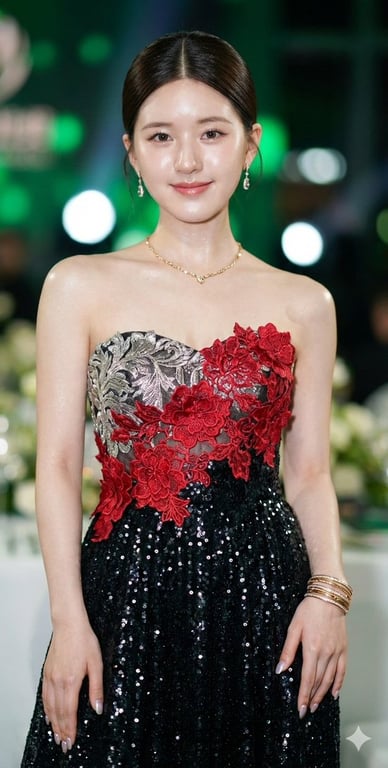 An image generation prompt for a high-glamour, close-up portrait of actress Zhao Lusi. It details her attire (strapless gown with metallic silver embroidery and bold 3D red floral lace appliqués on a black sequined skirt), makeup (glass skin, dewy), background (blurred evening gala bokeh), and camera style (macro photography).