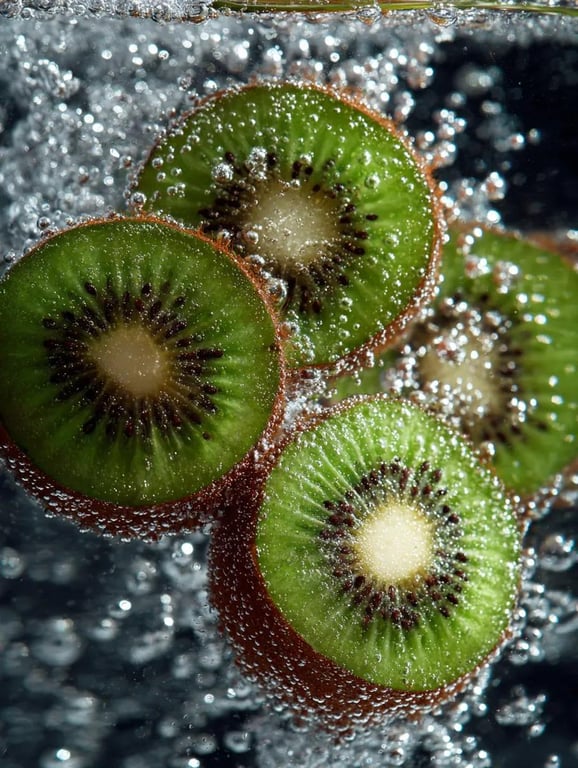 A prompt combining Gemini Nano Banana Pro and Kling 3.0 for generating an ultra-realistic macro shot of kiwi slices submerged in sparkling water, emphasizing vibrant colors, bubbles, crystal clear water, and premium drink photography aesthetics.