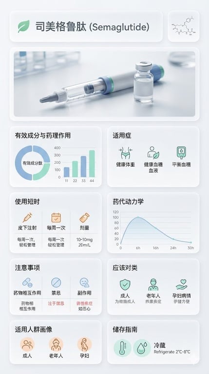 A comprehensive JSON-formatted prompt for Nano Banana Pro designed to generate a professional, humanized, and easy-to-read medical infographic poster for a drug (specifically Semaglutide is used as the default example). The style utilizes a modular Bento Grid layout, clean medical UI design, and a specific clinical color palette to present complex information like pharmacology, usage, and precautions.