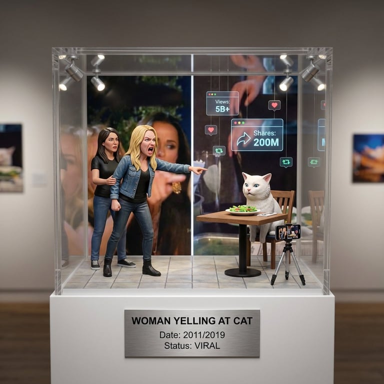 An instruction template designed to convert viral internet moments or memes into ironic-but-premium miniature display boxes (toy boxes). It requires analyzing the cultural context of the meme and recreating the exact scene with figurines, miniature screens showing spread metrics, and elements contrasting 'before viral' vs. 'after viral' status.