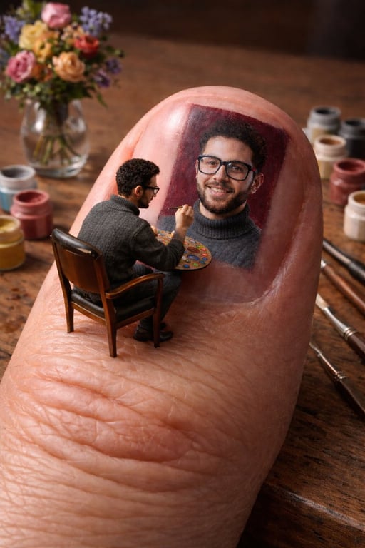 An ultra-realistic, macro photography JSON prompt for Nano Banana Pro, detailing a scene where a miniature artist is painting a highly detailed portrait on a gigantic human thumbnail, emphasizing scale contrast and fine details.