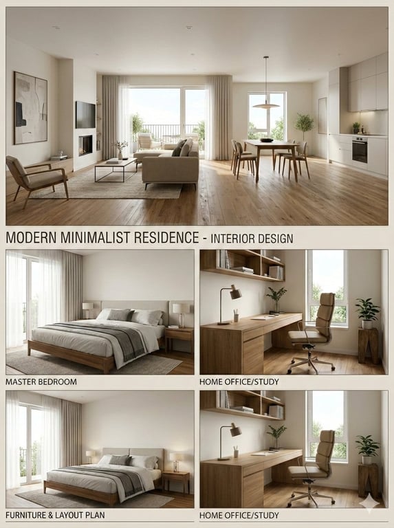 A prompt for generating a professional interior design presentation board based on an uploaded 2D floor plan. The output should be a collage featuring a large main image of the living/dining area and three smaller images showing the Master Bedroom, Home Office, and a 3D top-down floor plan, all rendered in a consistent Modern Minimalist style.