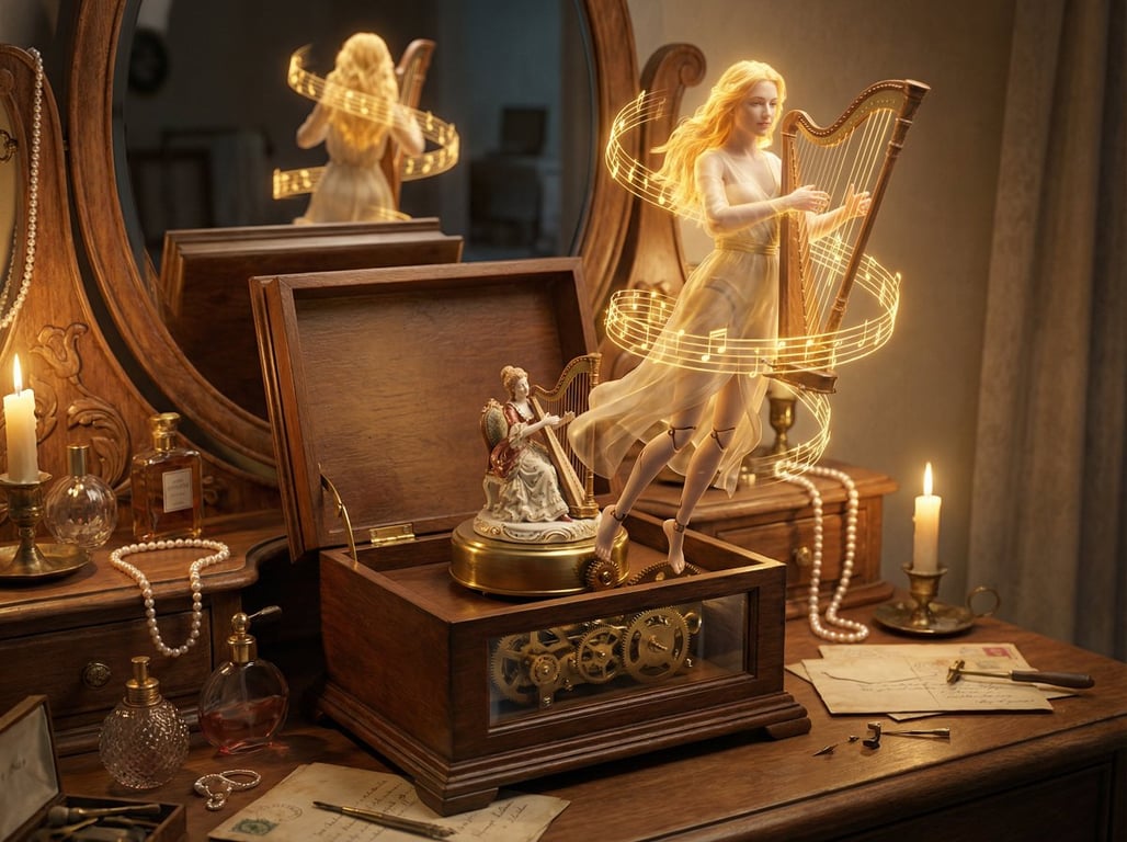 A highly creative and detailed prompt describing the transformation of a miniature music box dancer into a full-scale, breathing figure. It specifies the transition from porcelain to human anatomy, the visualization of the music box melody as spiraling golden notation, and the intimate boudoir setting.