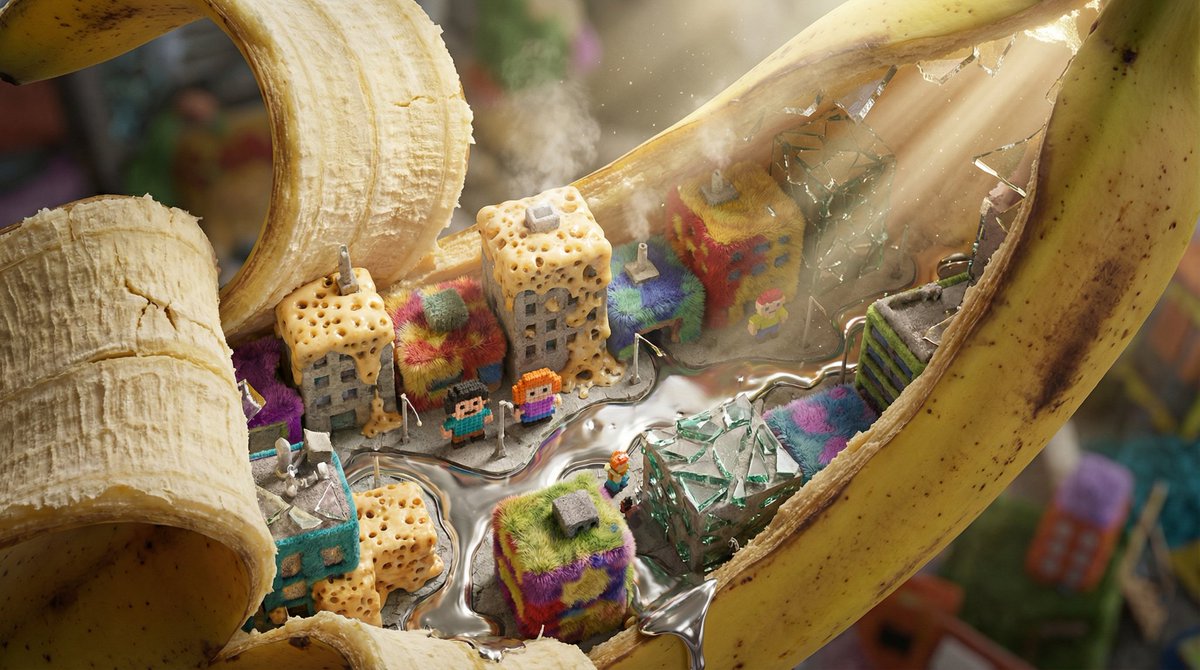 A highly imaginative prompt for generating a surreal, chaotic, and vibrant nano-scale cityscape contained within a banana peel, featuring unusual textures like bubbling cheese foam and velvet fur, with liquid mercury rivers and pixelated wool figures as inhabitants.