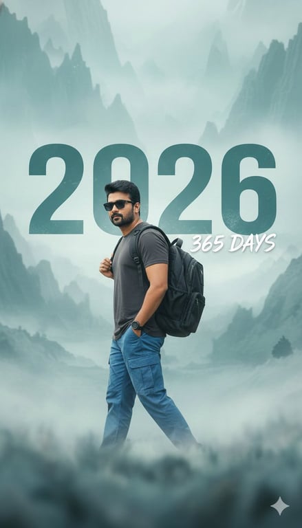 A prompt for generating an HD photo of a stylish young person walking confidently through a misty, ethereal landscape. The prompt specifies clothing, pose, lighting, and includes a large, bold teal text overlay reading '2026' and '365 DAYS', requiring the AI to maintain the face from an uploaded photo.