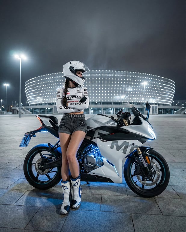 A detailed JSON prompt for generating a photorealistic image of a female motorcyclist leaning against a modern sportbike at night. The prompt specifies the subject's outfit (white racing jersey, dark shorts, white helmet), the bike's details (white and blue accents, blue underglow), and a complex pose (profile view, arms crossed). The setting is an urban plaza with massive modern architecture, using cool-toned lighting and specific camera settings for a cool, mysterious, and waiting vibe.